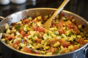 - Voeg de tomaten en courgette toe en kook nog 6 tot 7 minuten. Breng op smaak en haal de sauteerpan van het vuur.