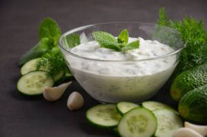 Tzatziki is een traditioneel Grieks gerecht dat bestaat uit Griekse yoghurt, komkommer, knoflook, verse kruiden en een vleugje olijfolie.