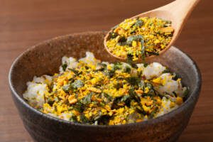 3. Noritama (nori + ei): Een licht zoete mix met gedroogd ei, ronder, licht zoet-hartig; populair bij kinderen.