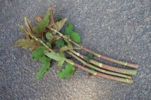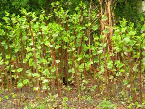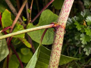 Japanse duizendknoop herken je het makkelijkst aan zijn bamboe-achtige habitus en de typische “knoopstructuur” van de stengel. In het vroege voorjaar verschijnen de jonge scheuten als stevige, rechtopstaande spruiten die vaak rood- tot bronsgroen aangelopen zijn. Ze groeien opvallend snel en hebben iets asperge-achtigs: mals zolang je ze met een duidelijke “knak” kunt breken. Naarmate de scheuten uitgroeien, ontwikkelen ze holle, cilindrische stengels met duidelijke verdikkingen op regelmatige afstanden (de knopen), waardoor de plant een gelede indruk geeft zoals bij bamboe. De stengels worden later groener en vertonen vaak fijne roodpaarse spikkels of vlekjes.